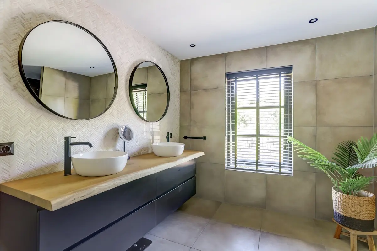 Deze badkamer is een absolute eyecatcher. In 2022 volledig vernieuwd en voorzien van grote keramische tegels, een stijlvol houten wastafelmeubel met dubbele waskommen, en een royale inloopdouche met infraroodpaneel. Het bad is vervangen voor extra ruimte en wellnessbeleving. Hier begint en eindigt u elke dag in comfort.